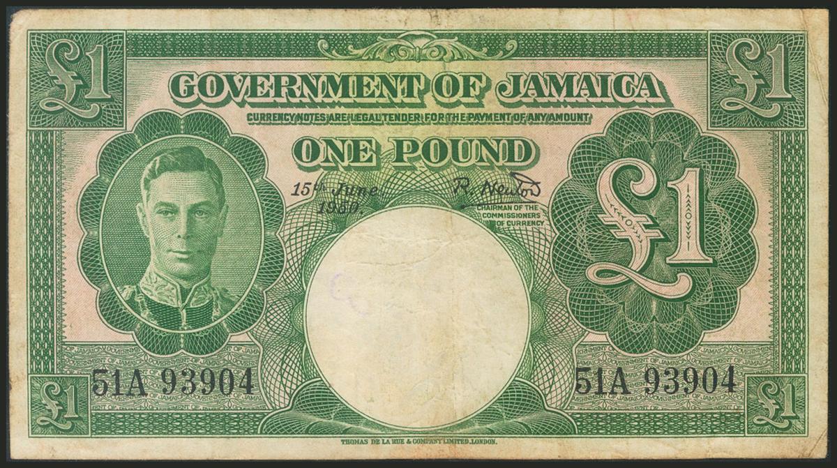 JAMAICA. 1 Pound. 15 June 1950. (Pick: 41b). Fine.