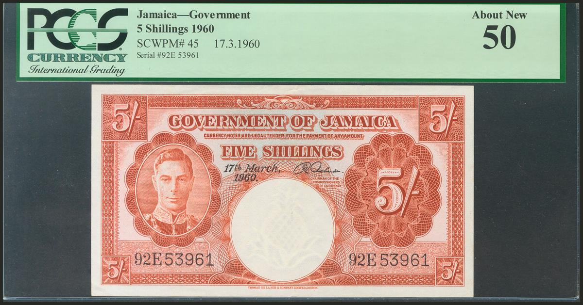 JAMAICA. 5 Shillings. 17 March 1960. (Pick: 45). PCGS50.