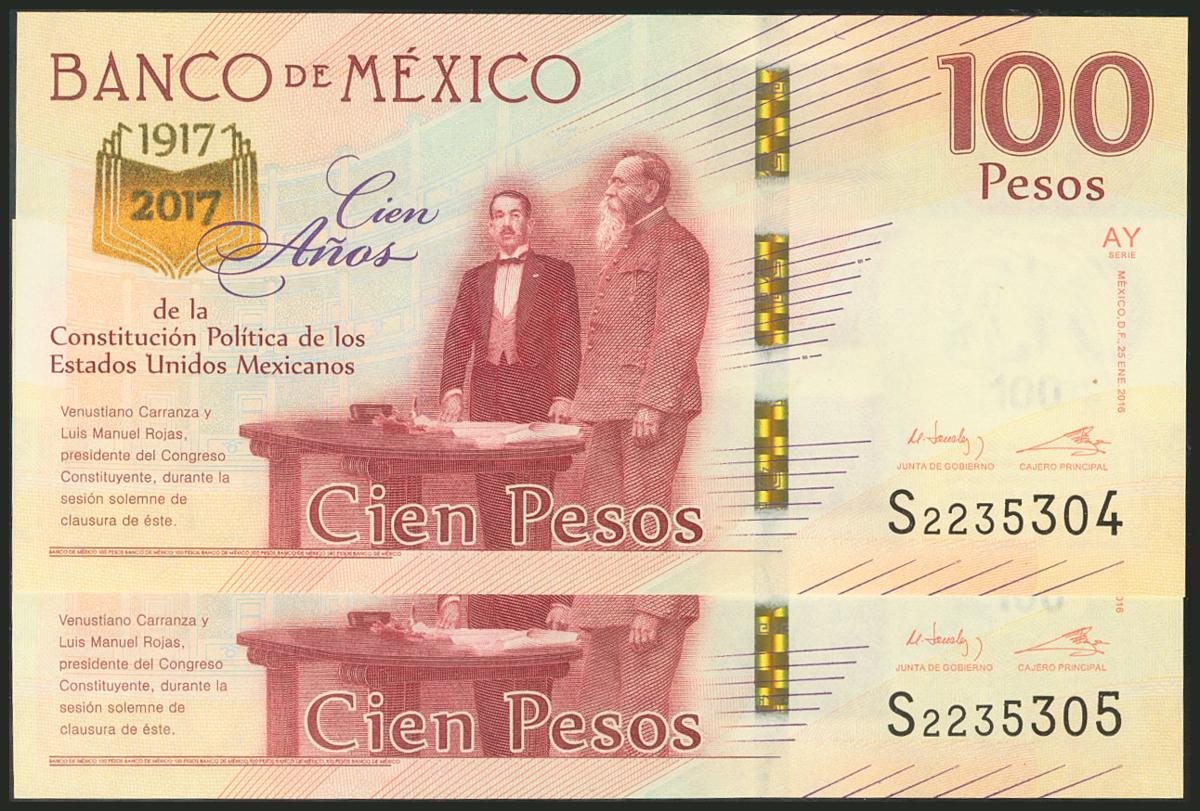 MEXICO. Set of 2 banknotes of 100 Pesos. 2017. Conmmemorative issue. Correlative pair. (Pick: 130). Uncirculated.