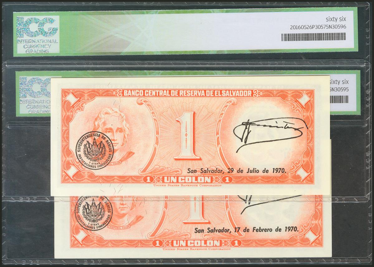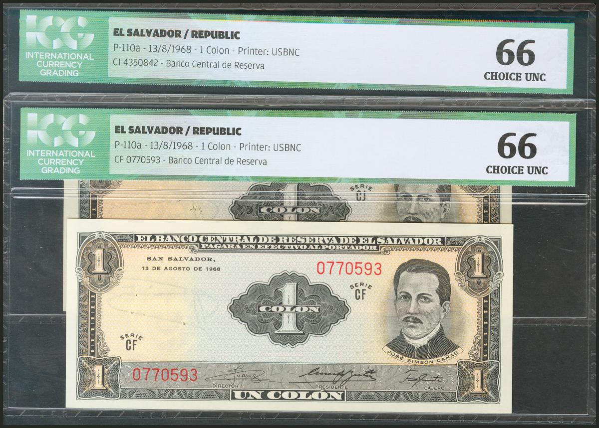 EL SALVADOR. Set of 2 banknotes of 1 Colón. 13 August 1968. (Pick: 110a). ICG66, both.