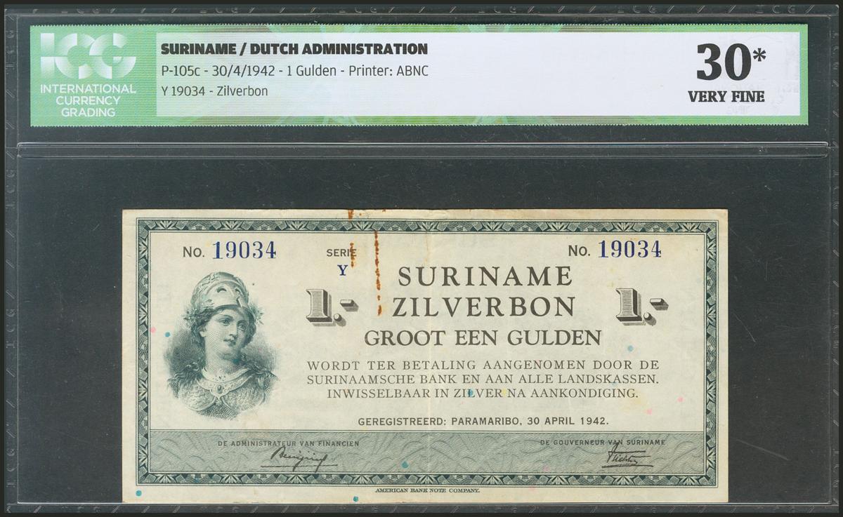 SURINAME. 1 Gulden. 30 April 1942. (Pick: 105c). ICG30* (rusty clip mark).