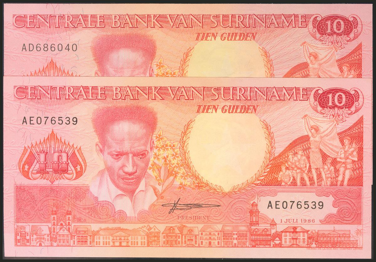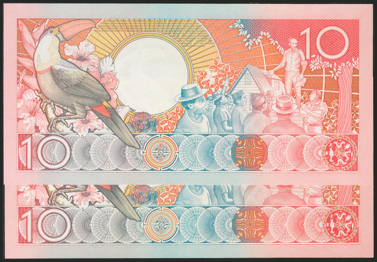 SURINAME. Set of 2 banknotes of 10 Gulden, issued on July 1, 1988. (Pick: 130a). Uncirculated.