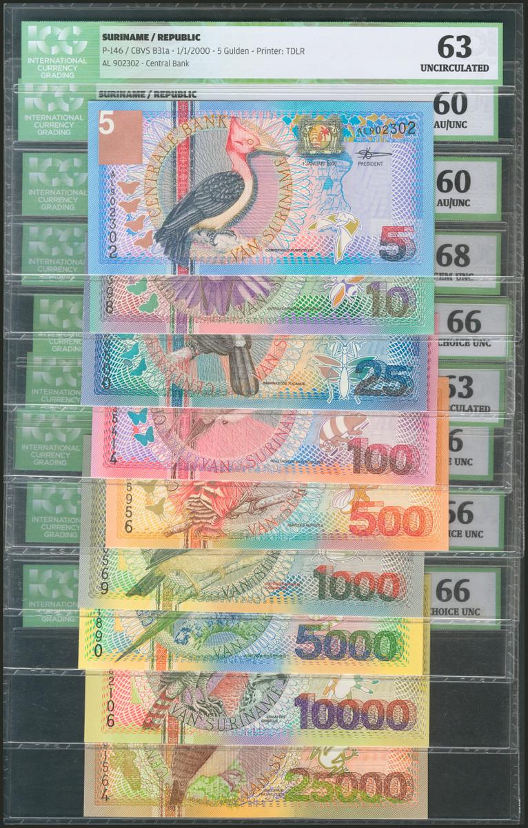 SURINAME. Set of 9 banknotes, issued 1 January 2000, values of 5, 10, 25, 100, 500, 1000, 5000, 10000, 25000 Guldens. (Pick: 146/154). All certified by ICG. Uncirculated.