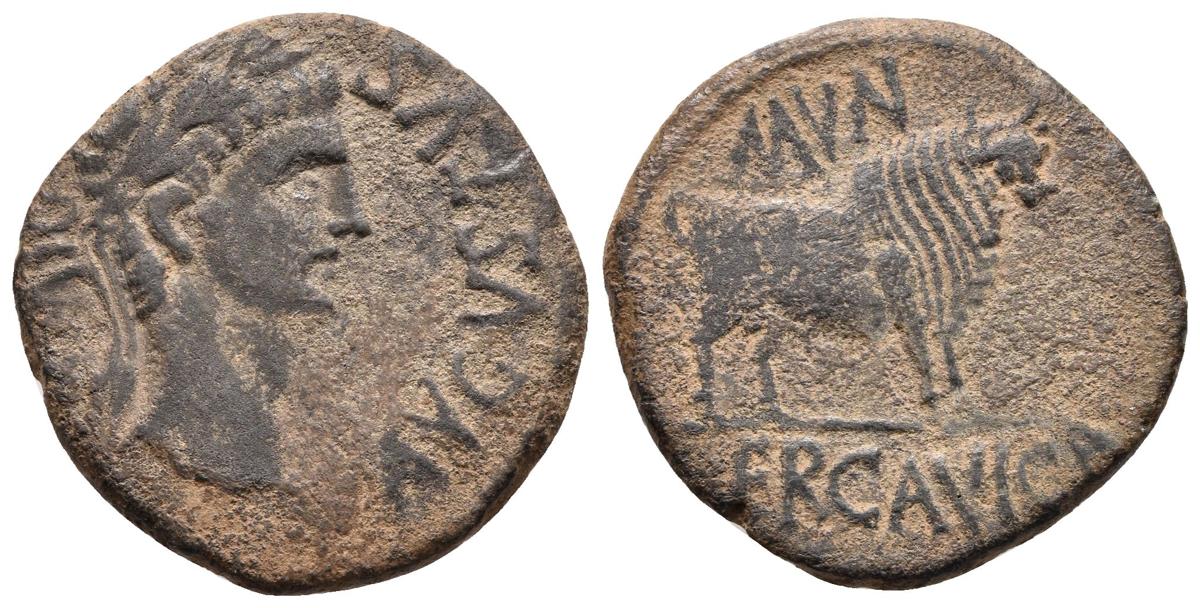 ERCAVICA. As. Epoca de Augusto. 27 a.C.-14 d.C. Cañaveruelas (Cuenca). A/ Cabeza laureada de Augusto a derecha, alrededor AVGVSTVS DIVI · F. R/ Toro a derecha con rabo curvo, encima MVN, debajo ERCAVICA. FAB-409. Ae. 8,92g. MBC.