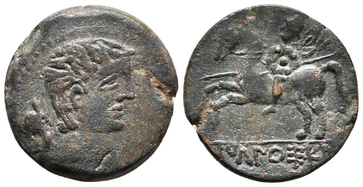 ICALCUSCEN. As. 120-20 a.C. Iniesta (Cuenca). A/ Cabeza masculina a derecha, detrás delfín. R/ Jinete con lanza y rodela a izquierda, debajo ICaLCuSCeN. FAB-1399. Ae. 7,50g. MBC-/MBC.