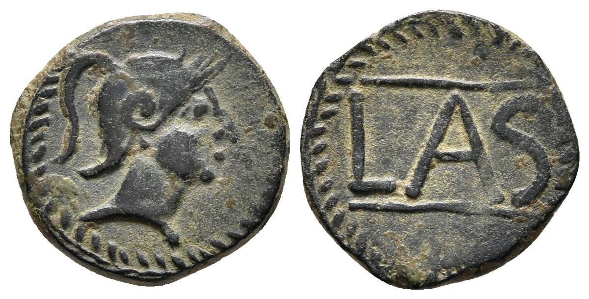 LASTIGI. Cuadrante. 150-50 a.C. Aznalcóllar (Sevilla). A/ Cabeza masculina con casco a derecha, dentro de láurea. R/ LAS entre líneas, dentro de láurea. FAB-1680. Ae. 2,73g. MBC+.