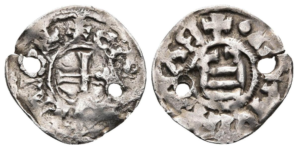 BISBE FRODOI. Diner de imitación carolingia. (870-890) Comtat de Barcelona. Cru.V.S. 11; Balaguer 13.3; Cru.C.G. 1808d. Ar. 1,36g. Dos perforaciones. MBC. Rarísima.
