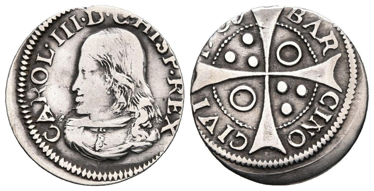 CARLOS III, El Pretendiente. 1 Croat. 1705/6. Barcelona. Cru.C.G. No cita; Badia No cita; Cal-No cita. Ar. 2,19g. MBC.