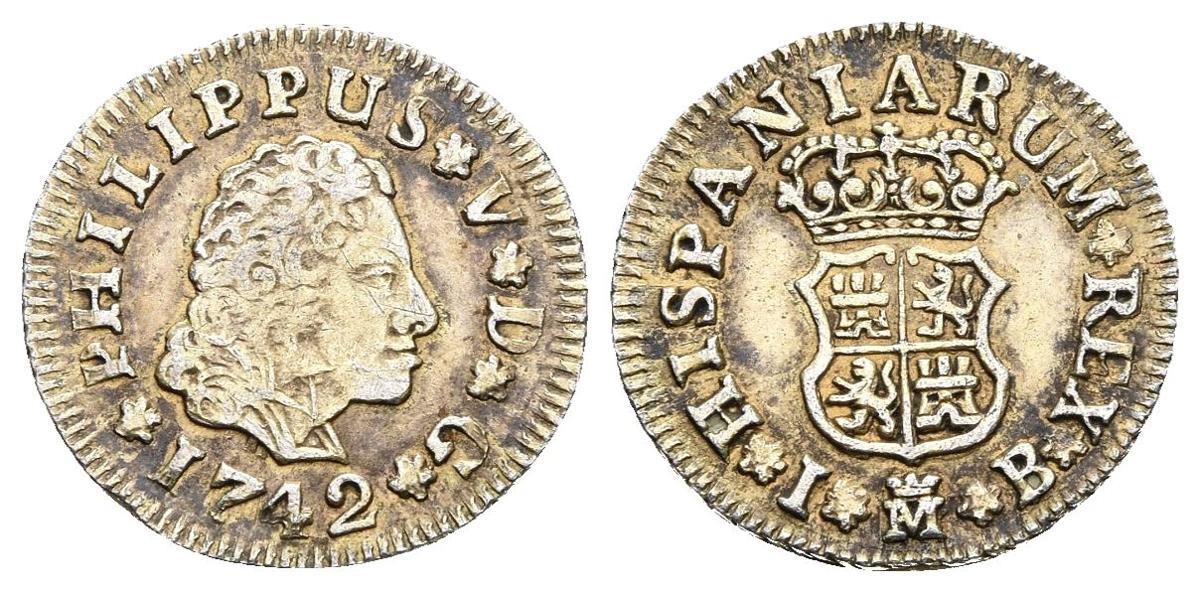 FELIPE V. 1/2 Escudo. 1742. Madrid IB, ensayador inventado. Cal-572 var. Au. 1,75g. Falsa de época en ¿platino? dorado. MBC.