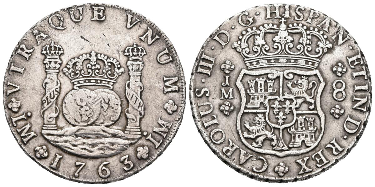 CARLOS III. 8 Reales. 1763. Lima JM. Columnario. Puntos sobre las dos LMA. Cal-839. Ar. 26,75g. Marquitas. MBC+.