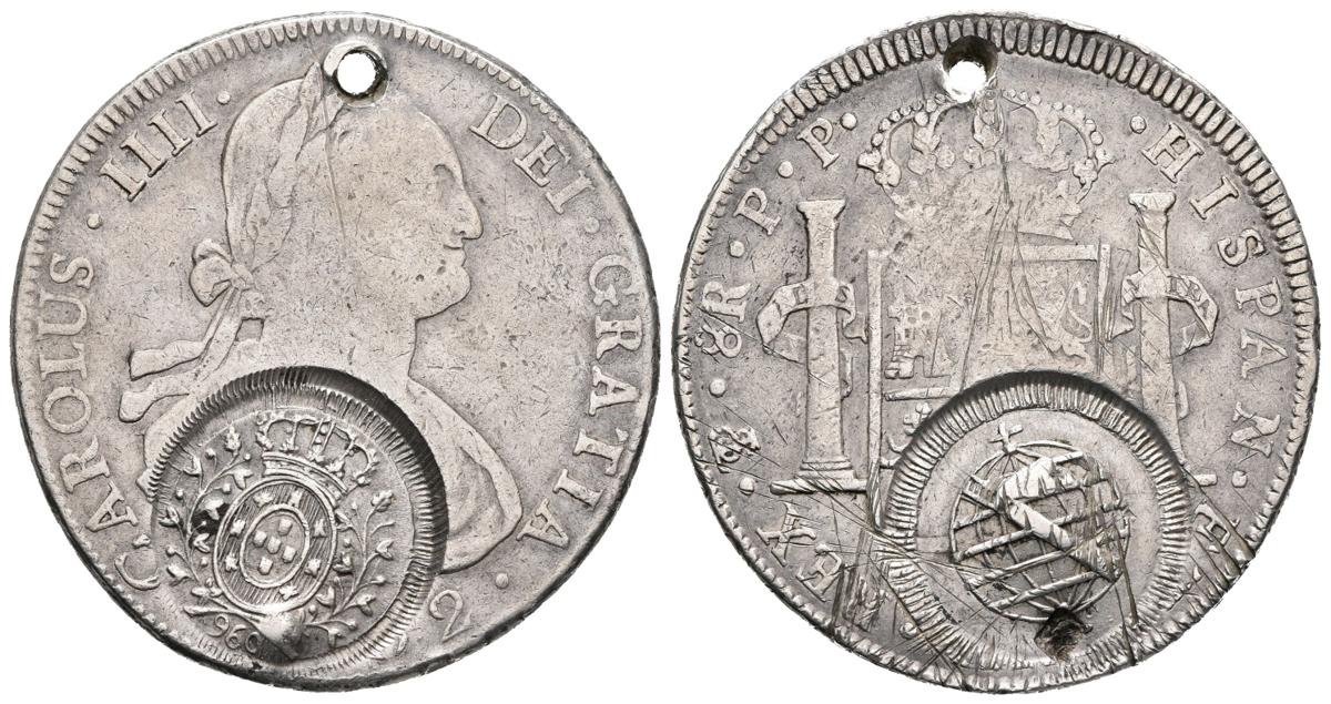 CARLOS IV. 8 Reales. 1802. Potosí PP. Resello de Brasil (De Mey 407-408) para circular por Brasil como 960 reis. Cal-725. Ar. 26,38g. Perforaciones y rayas en reverso. MBC-.