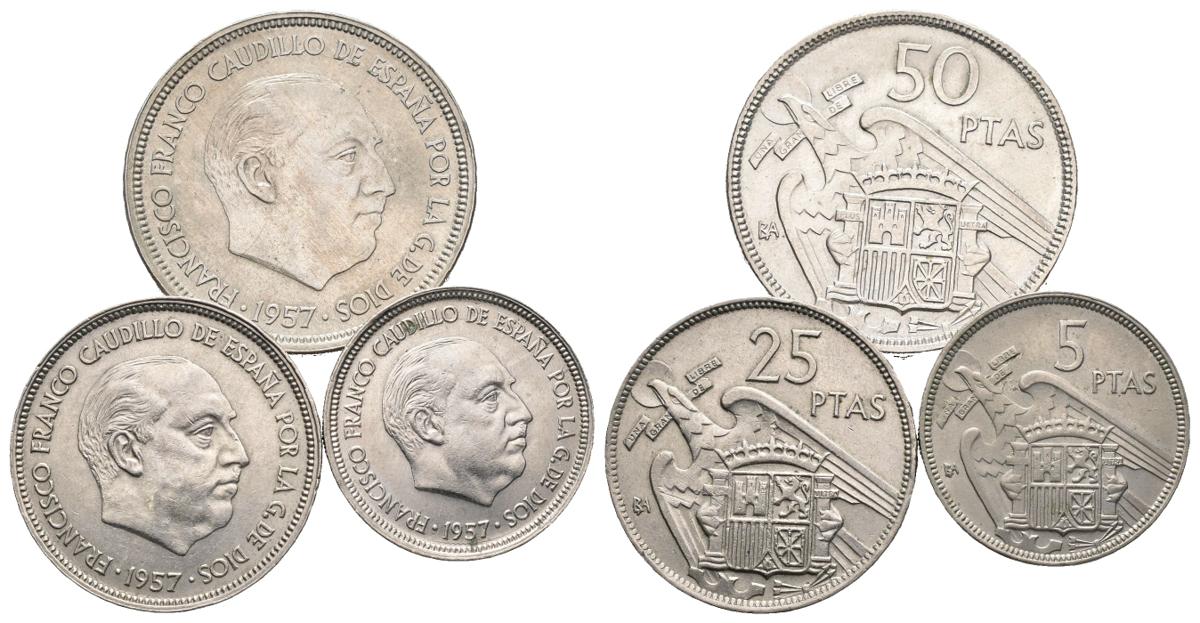 ESTADO ESPAÑOL. 1957. Barcelona BA. I Exposición Iberoamericana de Numismática. (5 ptas, 25 ptas y 50 ptas). Cal-139. MBC+/EBC-.