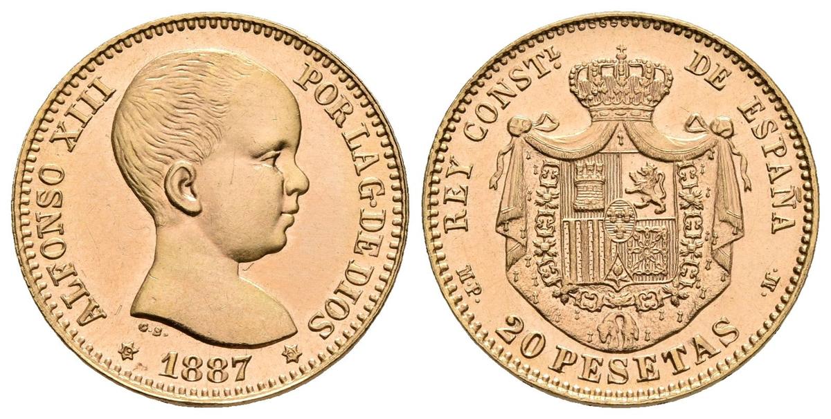ALFONSO XIII. 20 Pesetas. 1887 *19-61. Madrid MPM. Reacuñación oficial. Cal-5. Au. 6,45g. Brillo original. SC-.