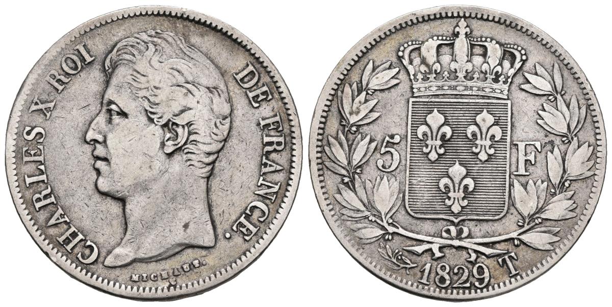 FRANCIA. Carlos X. 5 Francs. 1829. Nantes T. Gad.644 ; F.311. Ar. 24,69g. MBC-.