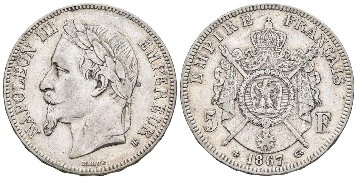 FRANCIA. Napoleón III. 5 Francs. 1867. Strasbourg BB. Km#799.1. Ar. 24,85g. MBC.
