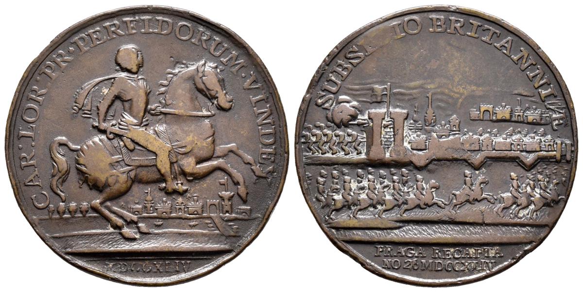 GRAN BRETAÑA. Medalla receptiva de Praga. 26 Noviembre 1744. A/ Estatua ecuestre de Carlos de Lorena a derecha. CAR:LOR:PR·PERFIDORUM·VINDE. R/ Imagen del asedio a la ciudad. SUBSIDO BRITANNIAE. Ae. 15,11g - 40mm. MBC.