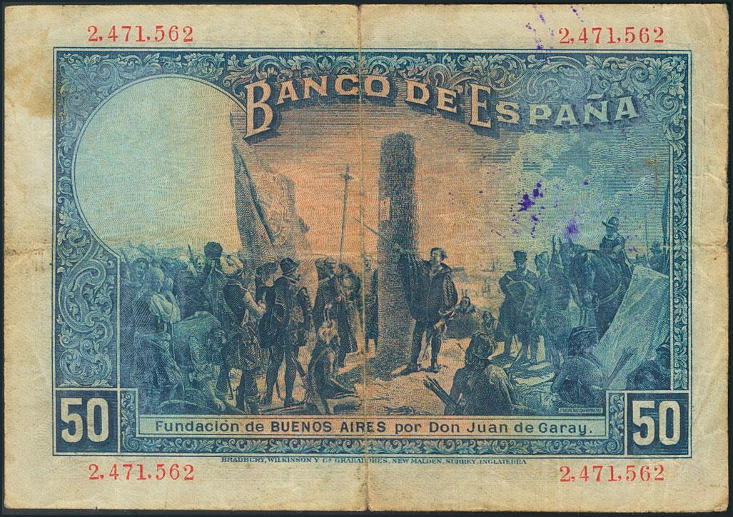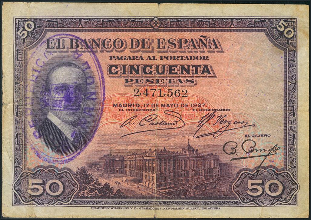 50 Pesetas resellado REPUBLICA / ESPAÑOLA sobre el billete del 17 de Mayo de 1927. (Edifil 2017: 332). BC.