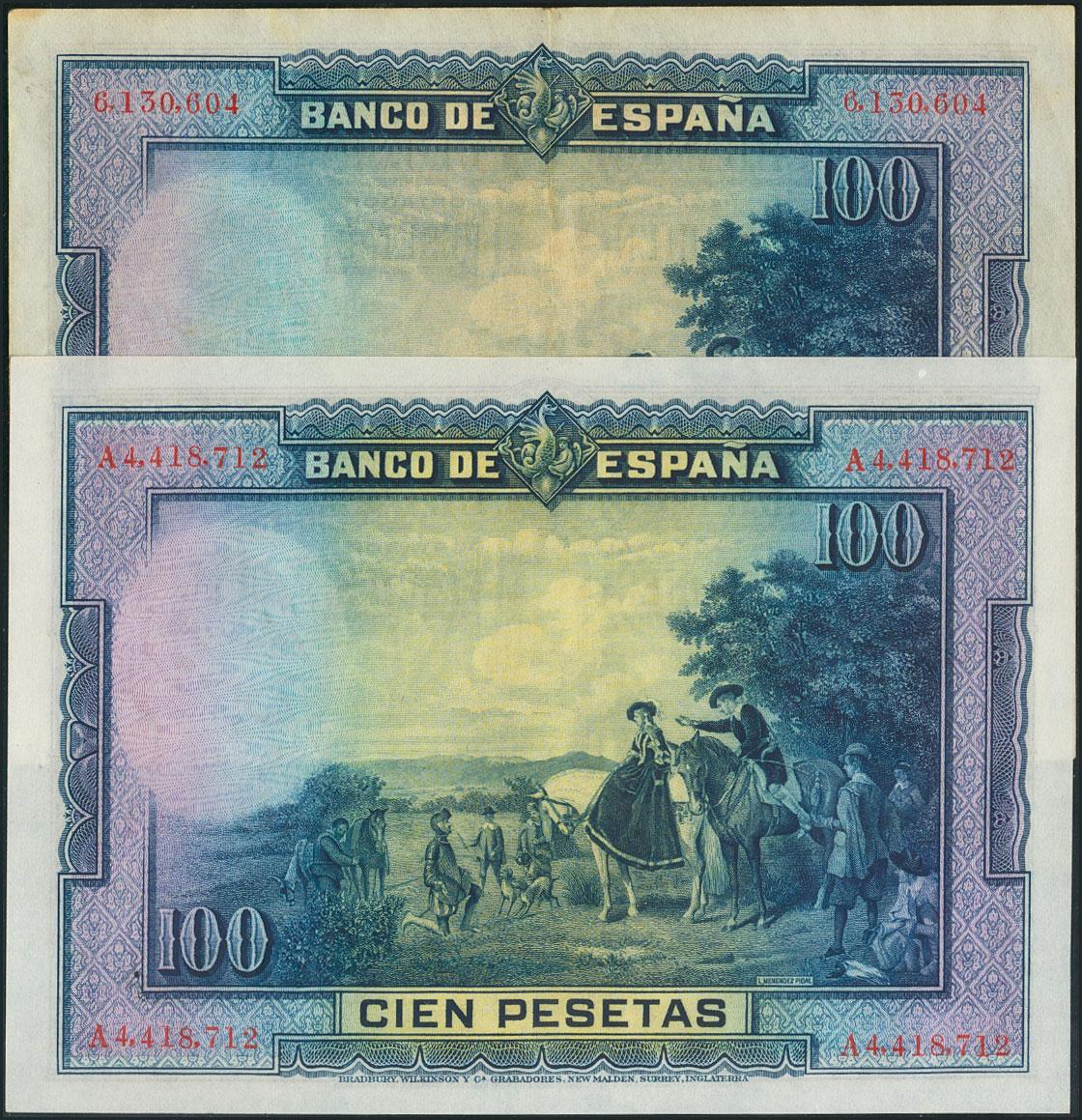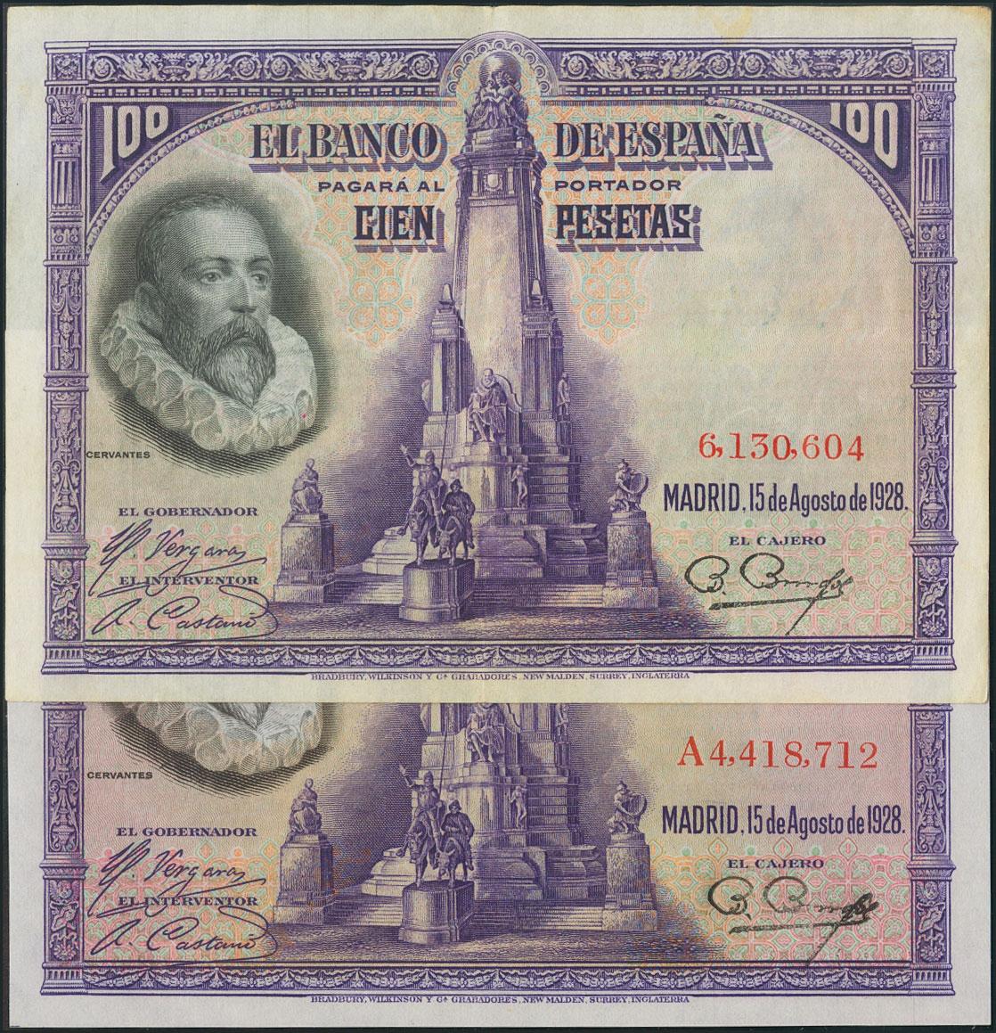 Conjunto de dos billetes de 100 Pesetas de la emisión del 15 de Agosto de 1928. Sin serie y serie A. (Edifil 2017: 355, 355a). MBC/SC-.