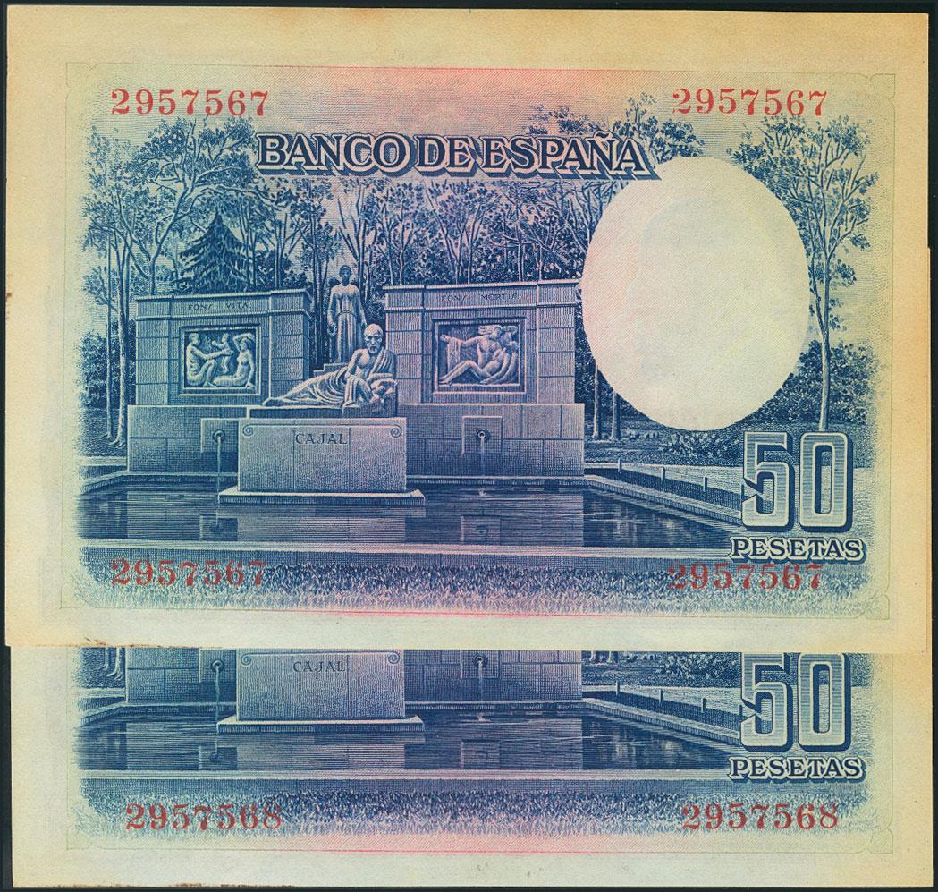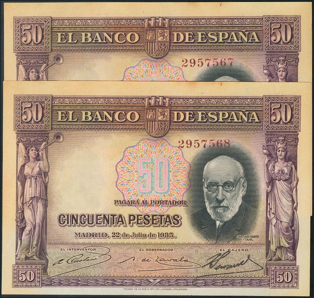 50 Pesetas. 22 de Julio de 1935. Sin serie, pareja correlativa. Tonalizados. (Edifil 2017: 366). MBC+.