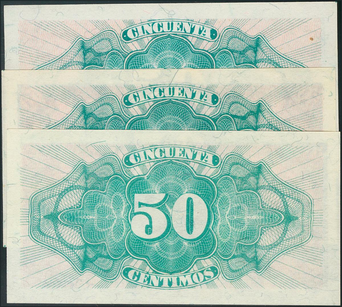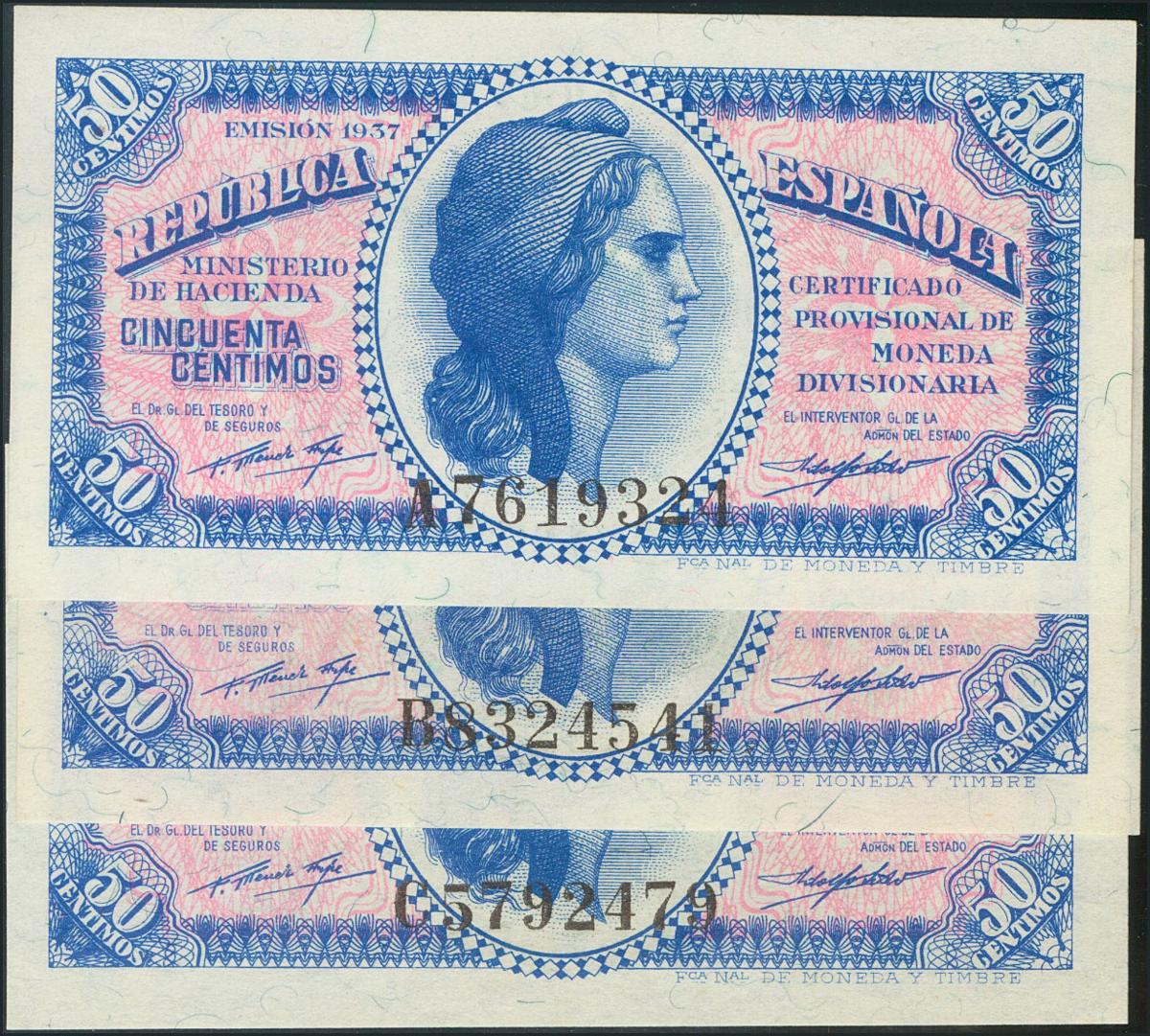 Conjunto de tres billetes de 50 Céntimos de la emisión del 18 de Enero de 1938, con las tres series conocidas A, B y C. (Edifil 2017: 391, 391a). SC.