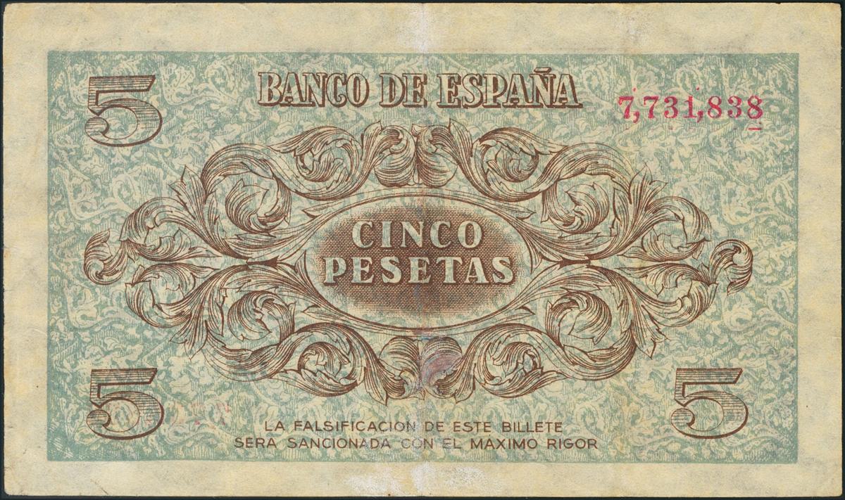 5 Pesetas. 21 de Noviembre de 1936. Banco de España, Burgos. (Doblez vertical y reparado) (Edifil 2017: 417). BC.