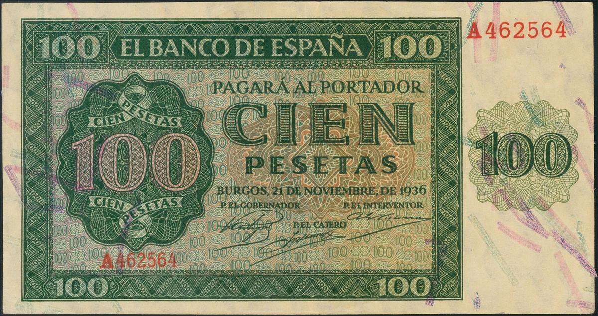 100 Pesetas. 21 de Noviembre de 1936. Banco de España, Burgos. Serie A. (Edifil 2017: 421). EBC.