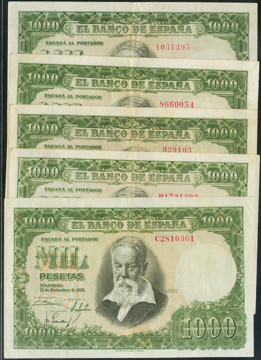 Conjunto de 5 billetes de 1000 Pesetas de la emisión del 31 de Diciembre de 1951, todos ellos sin serie. (Edifil 2017: 463). BC.