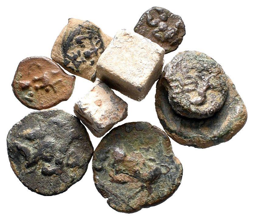 EBUSUS. Ibiza (Islas Baleares). Lote compuesto por 7 bronces y 2 premonedas de plomo. Los bronces son de diferentes valores desde 1/8 a 1/4 de Calco. MBC/MBC+. A EXAMINAR.
