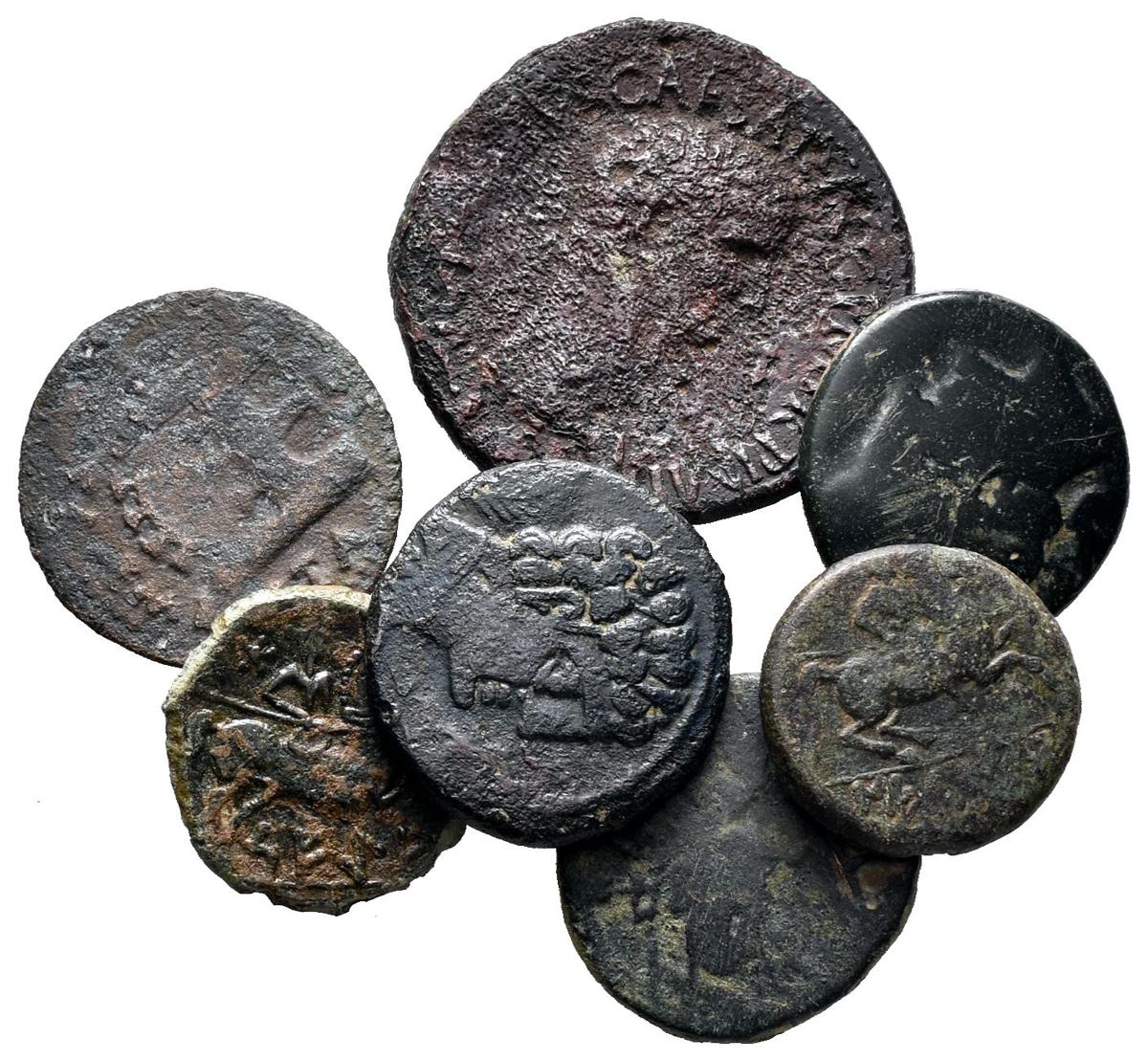 HISPANIA ANTIGUA. Lote compuesto por 7 bronces Ibéricos e Ibero Romanos de las cecas Tole, Segia, Secobirices, Bolscan, Secaisa, Emerita Augusta y un sestercio de Claudio. A EXAMINAR. BC+/MBC-.