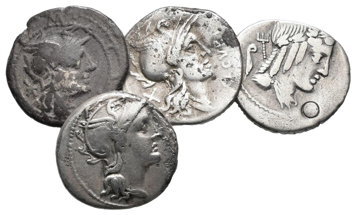 REPUBLICA ROMANA. Lote compuesto por 4 Denarios. C. Claudius Pulcher (Craw 300.1), L. Iulius Bursio (Craw 352.1), Q. Curtius & M. Silanus (Craw 285.2) y M. Acilius Marci (Craw 255.1). Ar. BC/MBC-. A EXAMINAR.