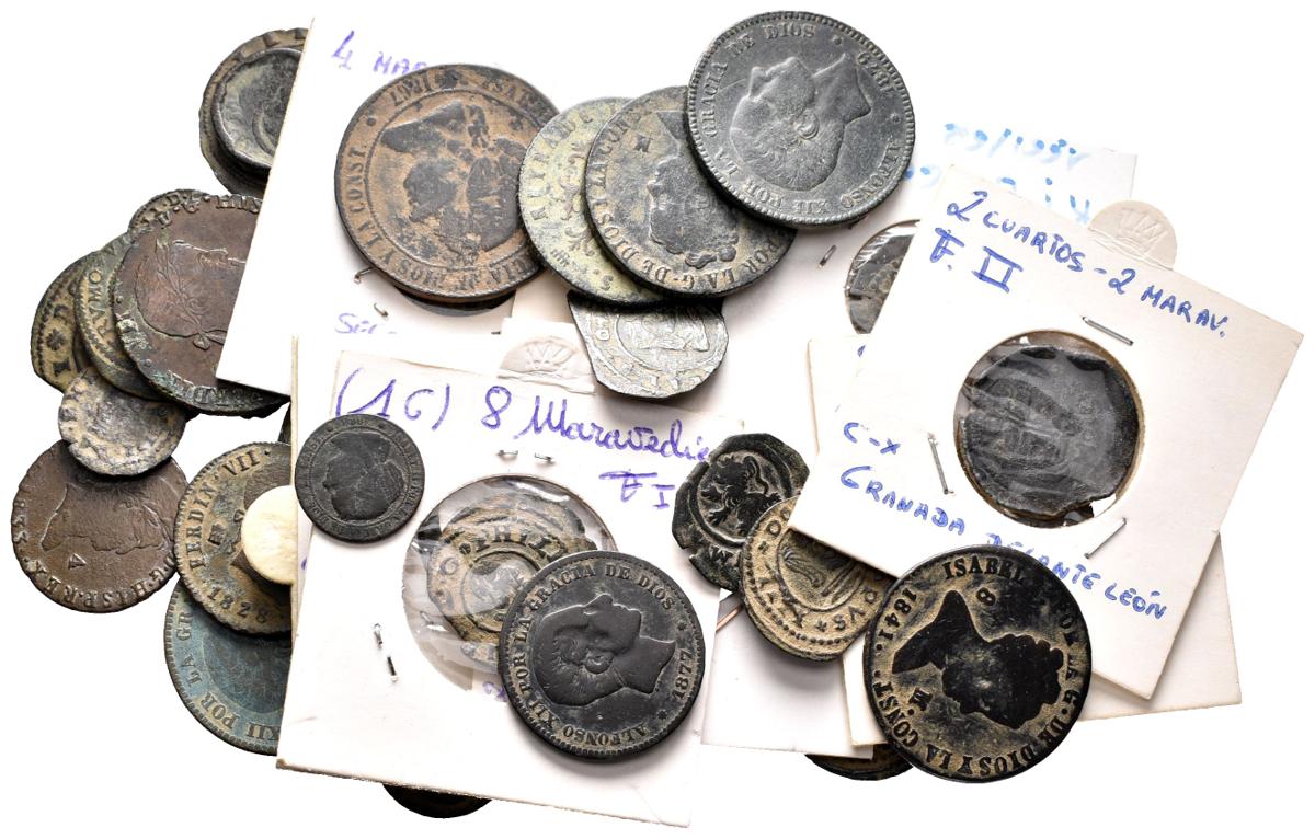 MONARQUIA ESPAÑOLA. Lote compuesto por 35 monedas de cobre variadas de diferentes reyes Felipe II, Felipe III, Carlos II, Felipe IV, Felipe V, Fernando VII, Isabel II y Alfonso XII. Incluye 1/2 real de Carlos II, varias acuñaciones a martillo y V Reis 1743 de Joannes V de Portugal. BC-/MBC+. A EXAMINAR.