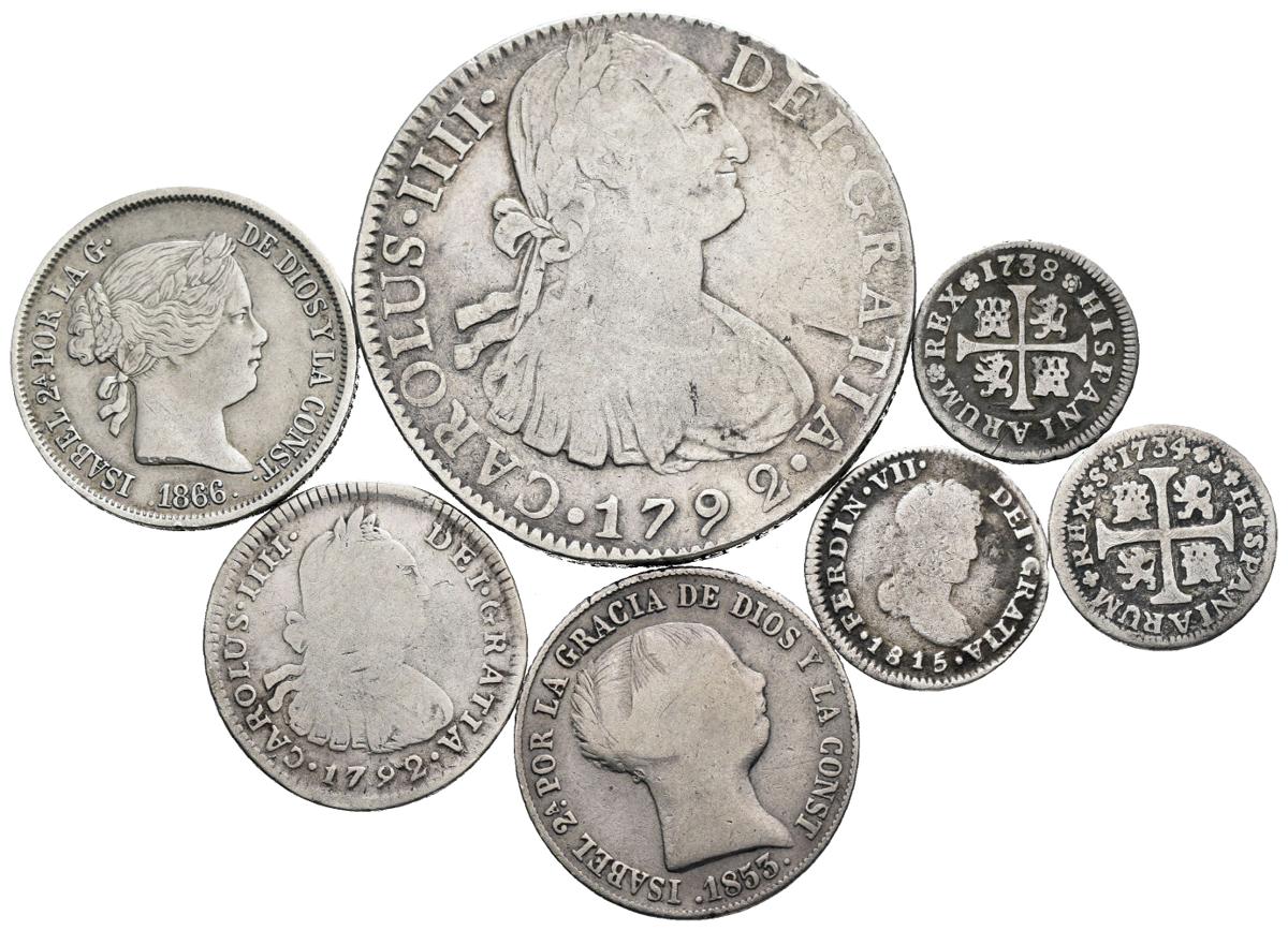 MONARQUIA ESPAÑOLA. Lote compuesto por 7 monedas de plata. Felipe V. 1/2 Real. 1734. Sevilla PA, Felipe IV. 1/2 Real. 1738. Madrid JF, Carlos IV. 8 Reales. 1792. México FM, Carlos IV. 1 Real. 1792. Lima JJ, Fernando VII. 1/2 Real. 1815. México JJ, Isabel II. 4 Reales. 1853. Barcelona E e Isabel II. 40 Céntimos de escudo. 1866. Madrid. BC/MBC+. A EXAMINAR.
