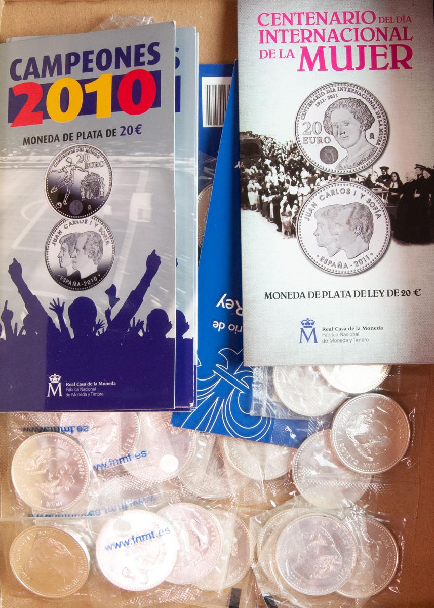 ESPAÑA. Lote compuesto por 38 monedas de plata de 12, 20 y 30 Euros, todas conmemorativas del 2002, 2004, 2007, 2010, 2011, 2012, 2013 y 2014 mayoritariamente presentadas en blíster y varias en cartera oficial. A EXAMINAR. EBC+/PROOF.