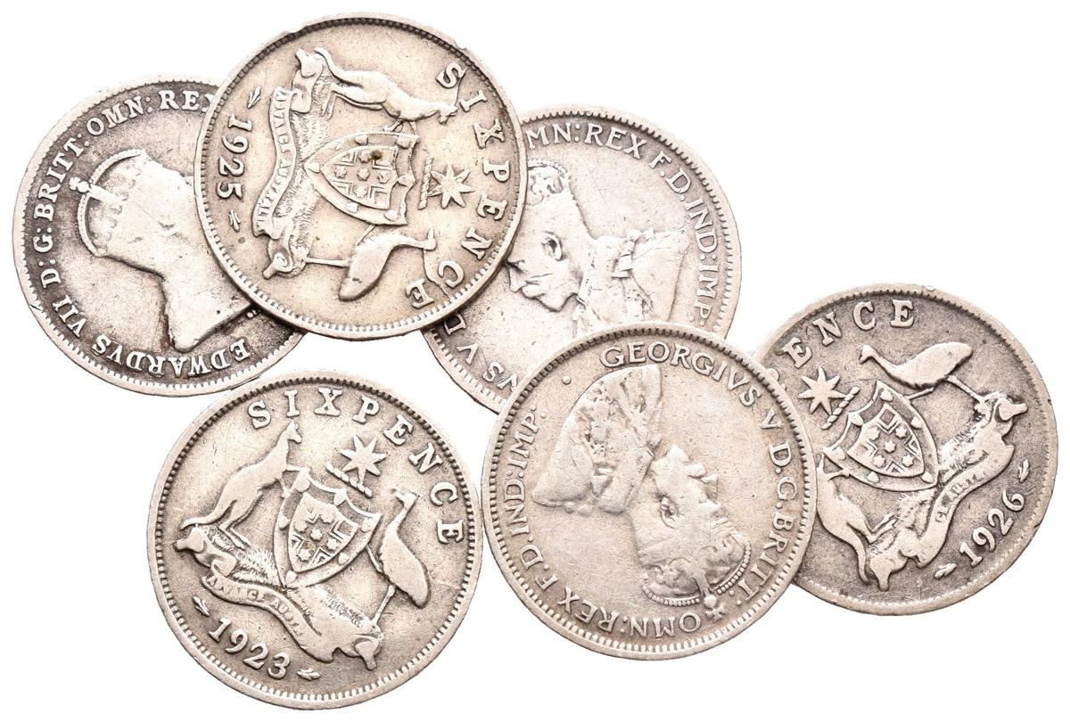 AUSTRALIA. Lote compuesto por 6 monedas de 6 Pence. 1910, 1922, 1923, 1925, 1926 y 1928, alguna escasa. Km#19/25. Ar. BC/MBC-. A EXAMINAR.