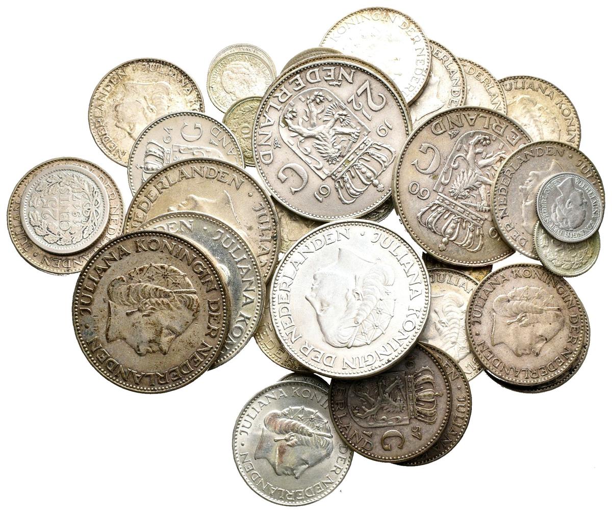 HOLANDA. Lote compuesto por 45 monedas de plata. Contiene 20 monedas de 10 céntimos de Wilhelmina y 23 monedas de 1/2, 1 y 2 Gulden de Julina. Calidades y fechas diversas.