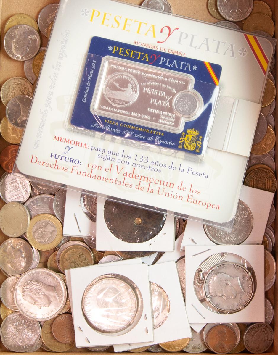 MUNDIAL. Lote compuesto por más de 150 monedas de diferentes países, varias de plata, tres de ellas de 100 Pesetas del Estado español, 2 Pesetas 1870 y un lingote de plata conmemorando los 133 años de la peseta (presentado en estuche oficial). BC/SC. A EXAMINAR.