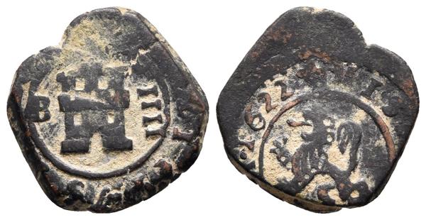 FELIPE IV. 8 Maravedís. 1662. Madrid Y. Tanto ceca como ensayador y el valor 8 están rectificados, este último acotado con doble punto inferior. Cal-1427; J.S. M-No cita. Ae. 1,72g. Doblez central. MBC+. Rara.