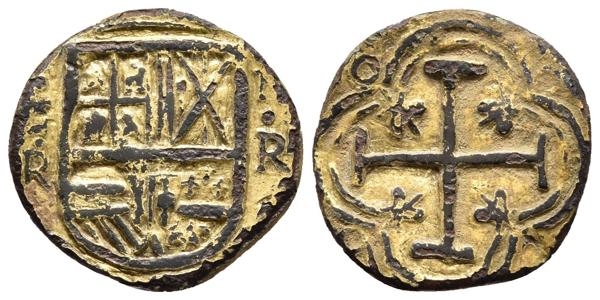 FELIPE IV. 2 Escudos. (1621-1665). Santa Fe de Nuevo Reino R. Cal-Tipo 36; Restrepo tipo M50. Ae. 3,34g. Falsa de época en cobre dorado. MBC. Escasa.