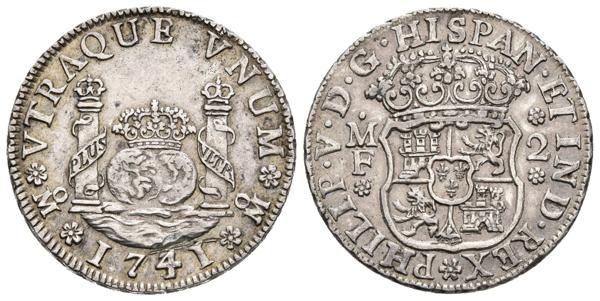 FELIPE V. 2 Reales. 1741/31 sobrefecha. México MF, ensayador acotado por punto y florón. Columnario. Cal-1291var. Ar. 6,75g. Raya en anverso. EBC-.