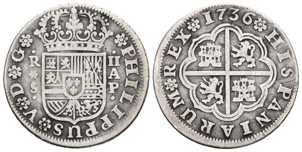 FELIPE V. 2 Reales. 1736. Sevilla PA. Cal-1437. Ar. 5,65g. MBC-. Escasa.