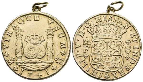 FELIPE V. 8 Reales. 1741. México MF. Columnario. Cal-791. Ar. 27,39g. Sobredorada y con anilla. MBC.