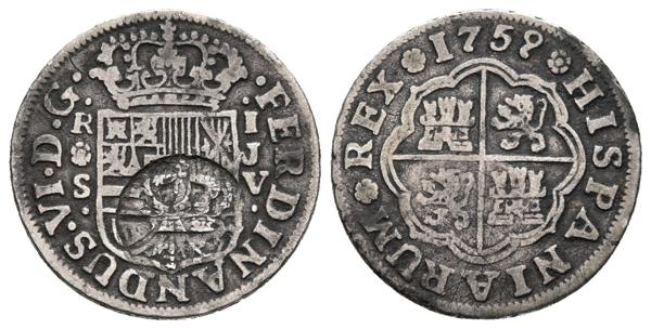FERNANDO VI. 1 Real. 1759. Sevilla JV. Resello GP bajo corona (MBC-), del Gobierno Portugués. Cal-615. Ar. 2,73g. MBC.