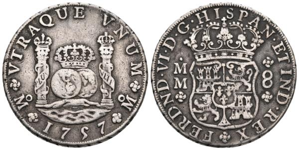 FERNANDO VI. 8 Reales. 1757. Méjico MM. Columnario. Cal-342. Ar. 26,73g. Leve concreción en el canto. MBC.