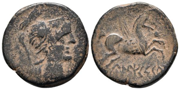 VALENTIA. As. 150-50 a.C. Valencia. A/ Cabeza galeada de Roma a derecha, alrededor C.MVNI.Q.-C.LVCIEN. R/ Dentro de láurea cuerno de la abundancia sobre fulmen. FAB-2510. Ae. 21,36g. MBC-.