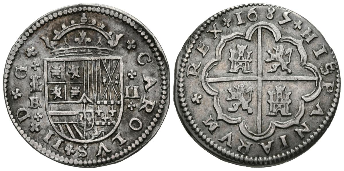 CARLOS II (1665-1700). 2 Reales. (Ar. 6,03g/27mm). 1685. Segovia BR. (Cal-2019-447). MBC+.