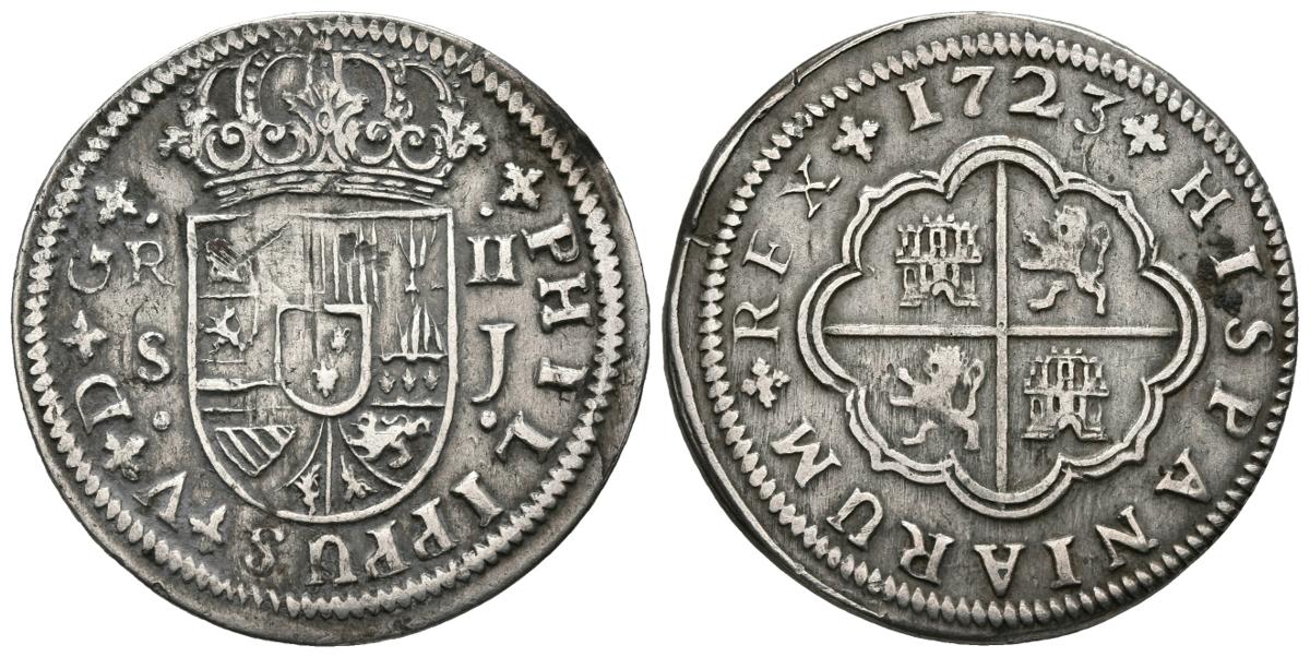 FELIPE V (1700-1746). 2 Reales. (Ar. 5,27g/28mm). 1723. Sevilla J. (Cal-2019-981). MBC-.