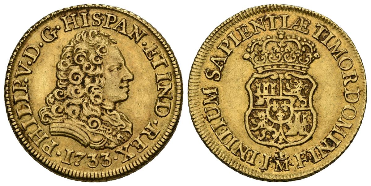 FELIPE V (1700-1746). 2 Escudos. (Au. 6,78g/23mm). 1733. Madrid JF. (Cal-2019-1870). Sin indicación de valor. MBC+. Escasa. Bonito ejemplar.
