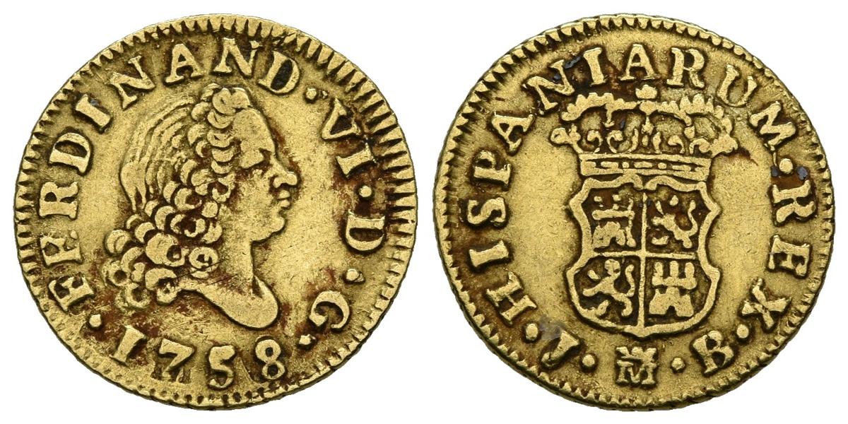 FERNANDO VI (1746-1759). 1/2 Escudo. (Au. 1,74g/15mm). 1758. Madrid JB. (Cal-2019-564). Cuarto busto. MBC.