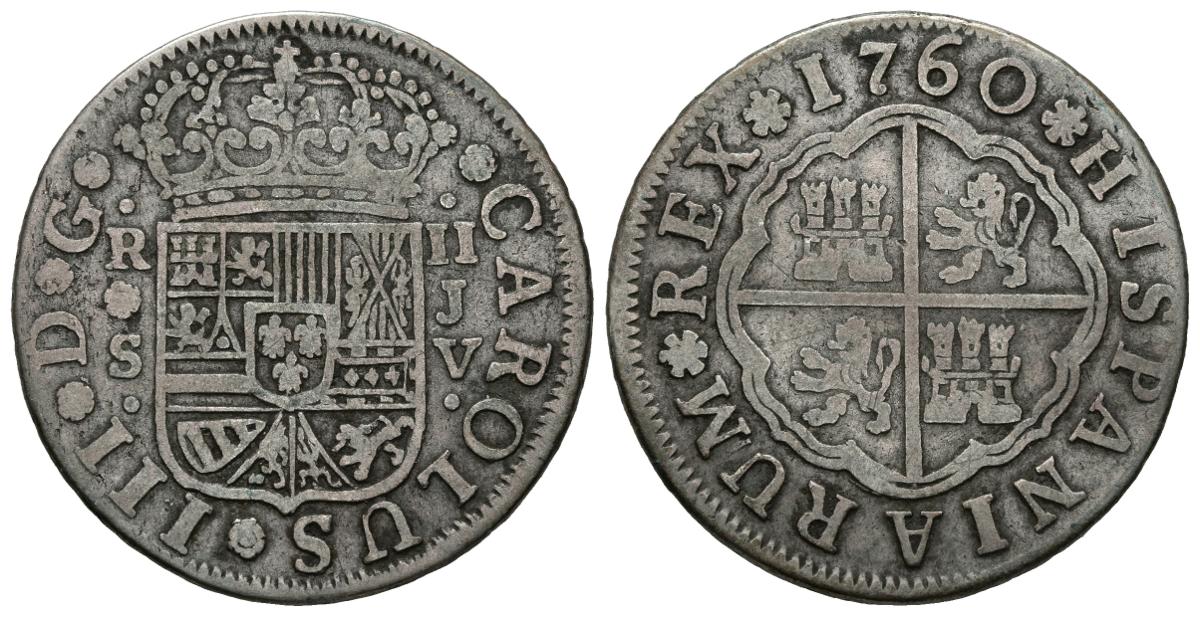 CARLOS III (1759-1788). 2 Reales. (Ar. 5,55g/26mm). 1760. Sevilla JV. (Cal-2019-772). MBC-.