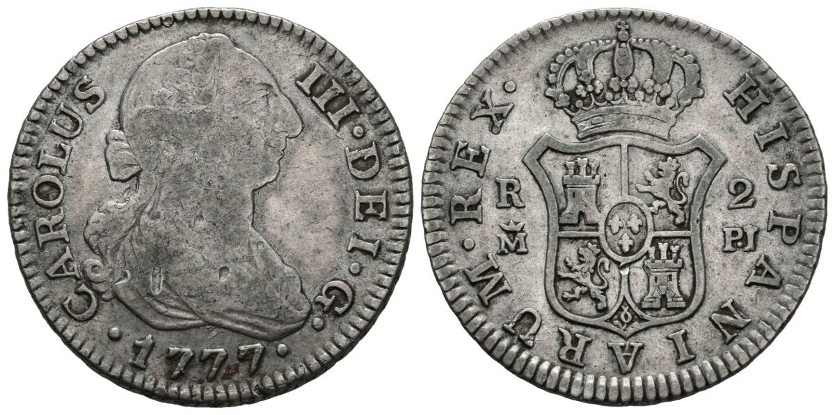 CARLOS III (1759-1788). 2 Reales. (Ar. 5,79g/27mm). 1777. Madrid PJ. (Cal-2019-626). BC+.